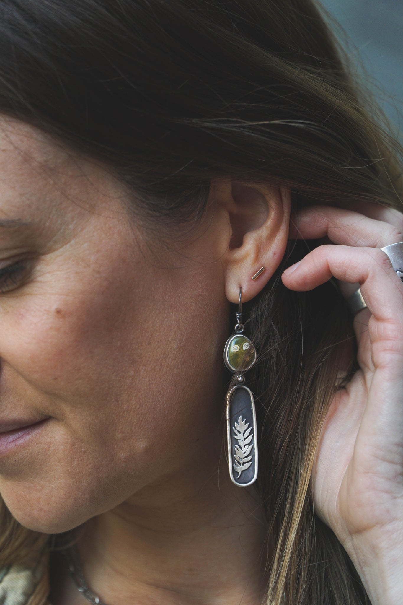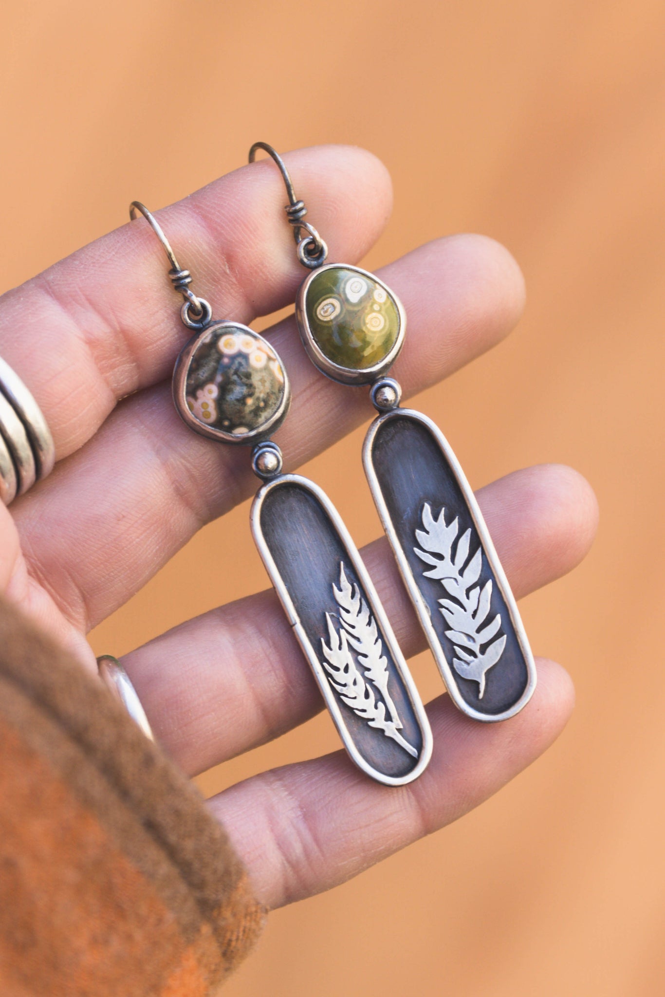 These earrings are sisters, not twins. Both feature sterling silver botanicals sawed out by hand and soldered over copper and colorful Ocean Jasper stones. Finished with sterling silver ear wires so everything that touches the skin is non reactive. They weight less than 6 grams per earring (about the weight of one quarter) and measure about 2 and 3/4 of an inch in length.