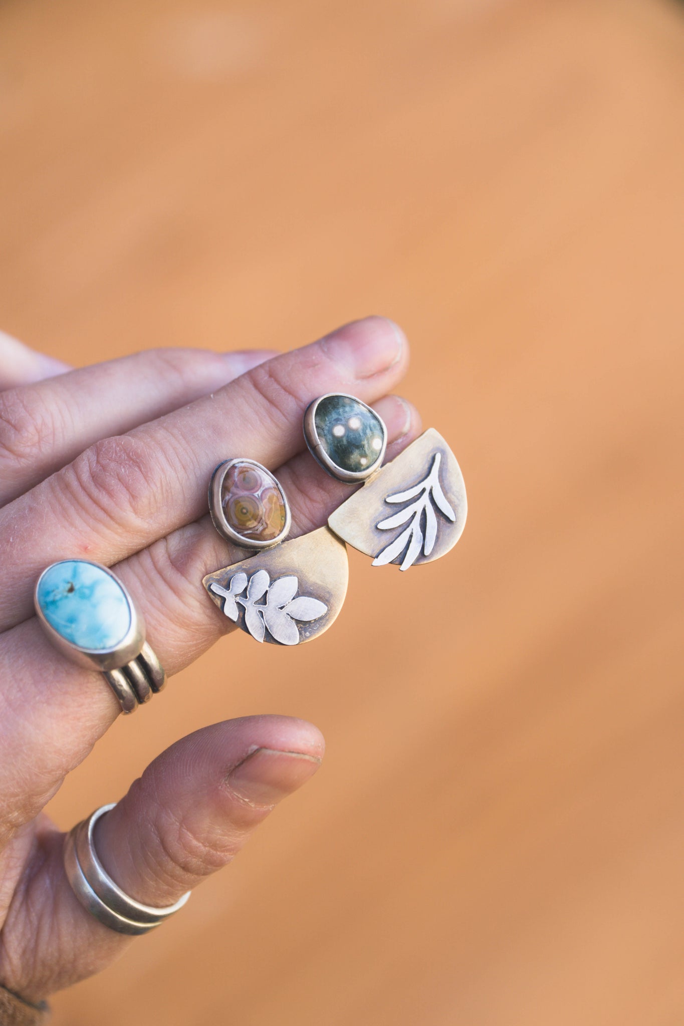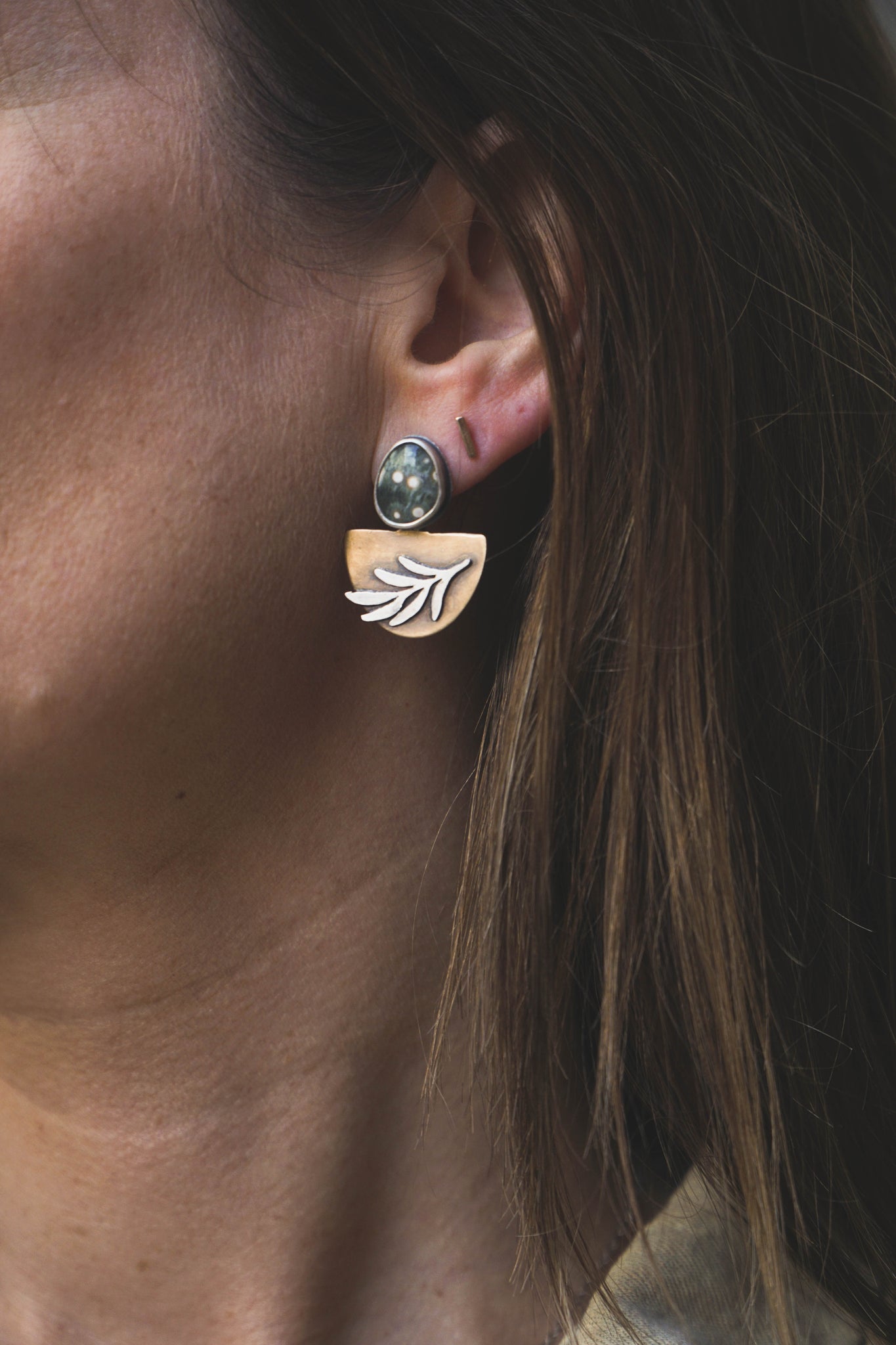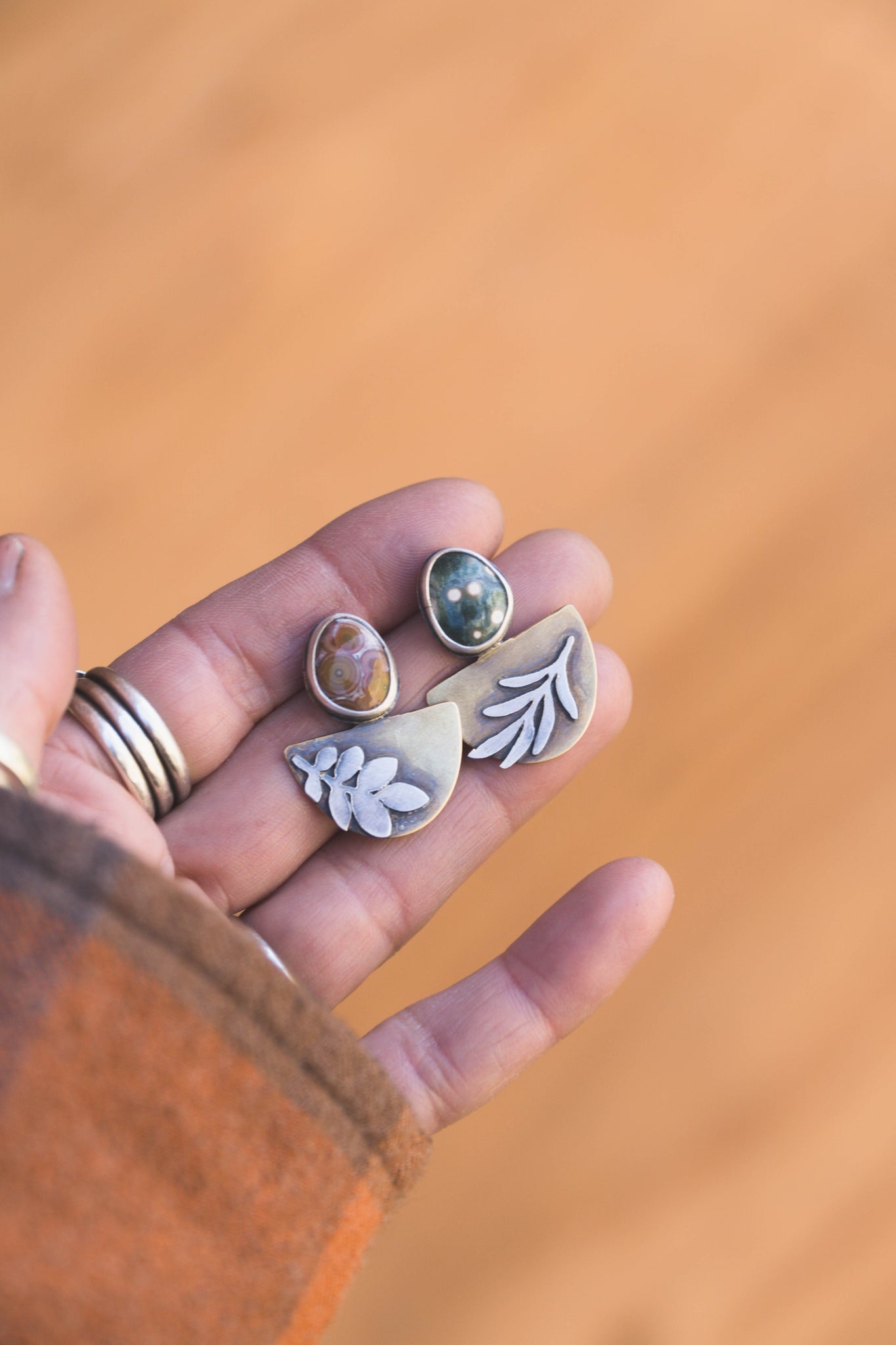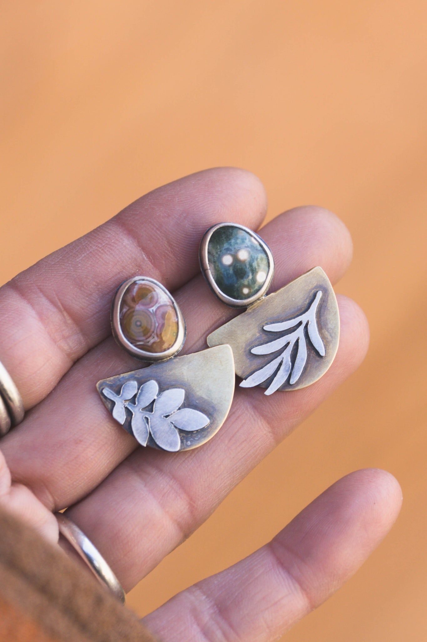 These earrings are sisters, not twins. Both feature sterling silver botanicals sawed out by hand and soldered over brass and colorful Ocean Jasper stones. Sterling silver backs so everything that touches the skin is non reactive. These are a fun pair to wear to dress up or down.