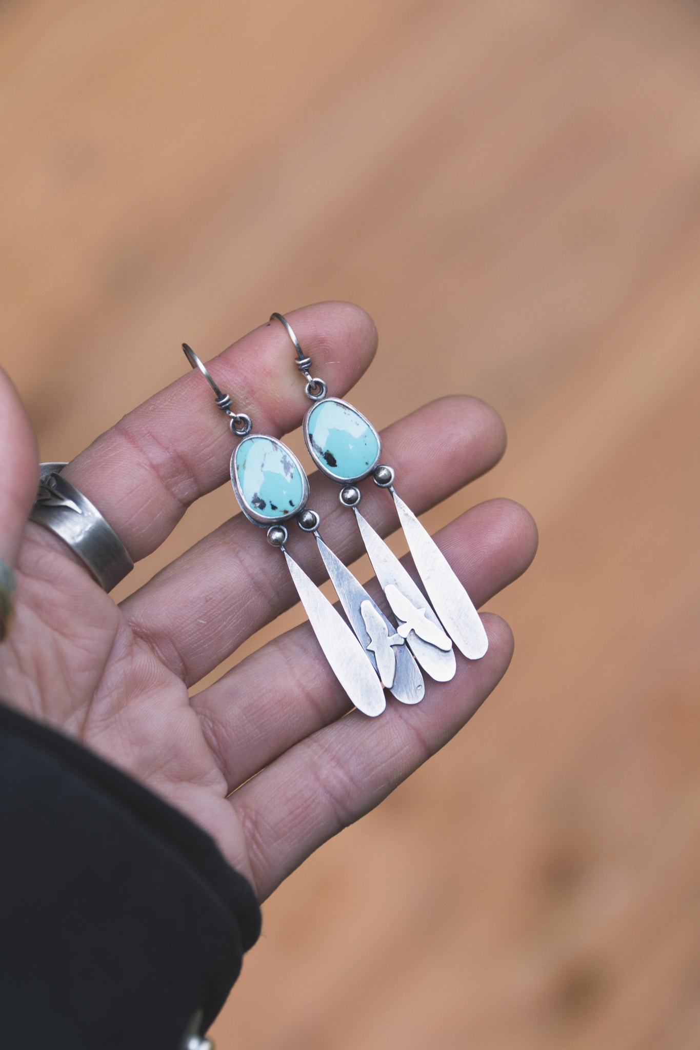 The kind of earrings I dream about. Speckled blue Kingman Turquoise paired with soft sterling silver fringe. This pair measures 2.5 inches and weigh 4.5 grams each.