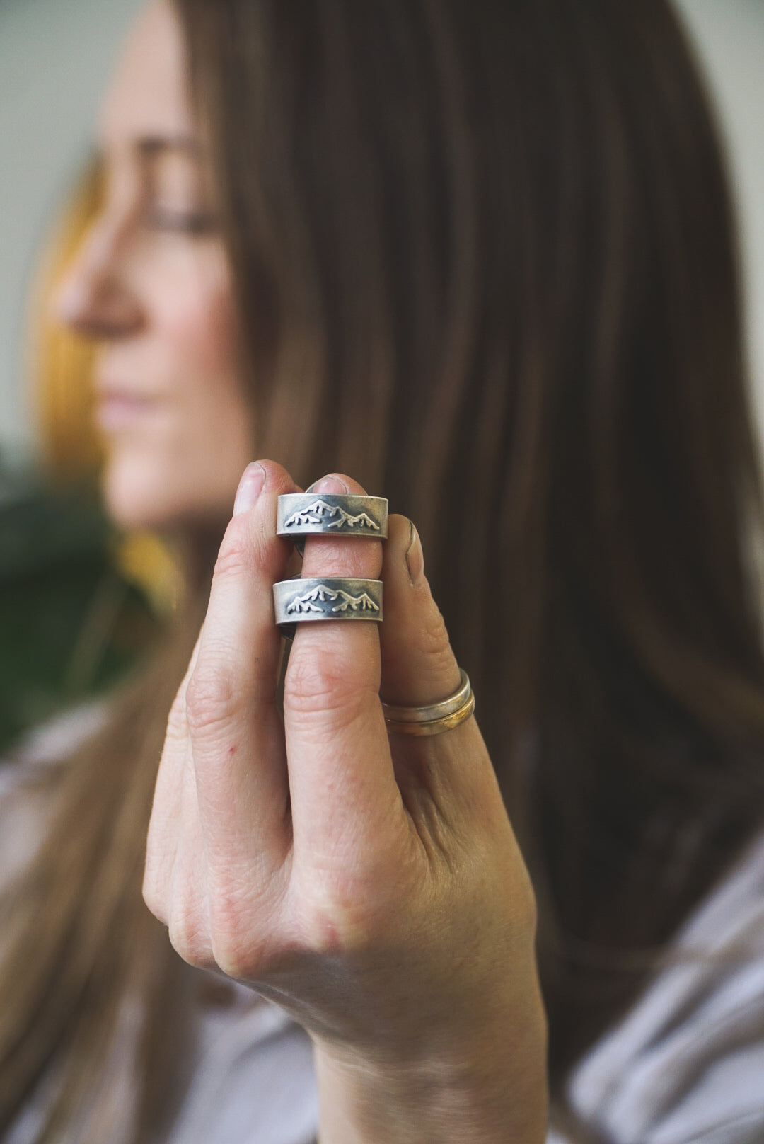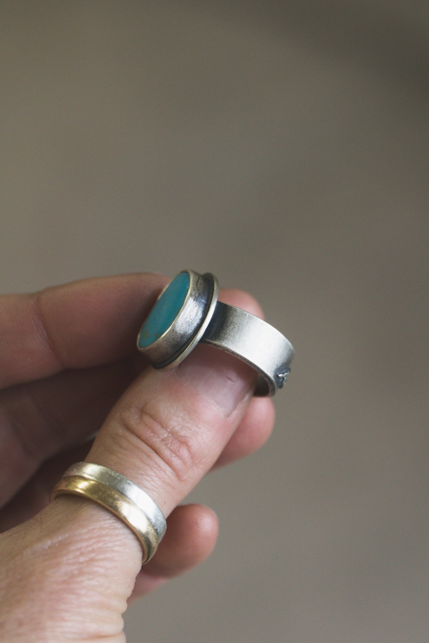 This ring features a high grade cut of Kingman Turquoise set in sterling silver. This ring was made with over 95% repurposed silver which I personally melted down and remilled into workable metal. It's a long process but always feels so worth it. This ring features a mountain on the underside of the band and measures a size 7.5 on my ring mandrel.