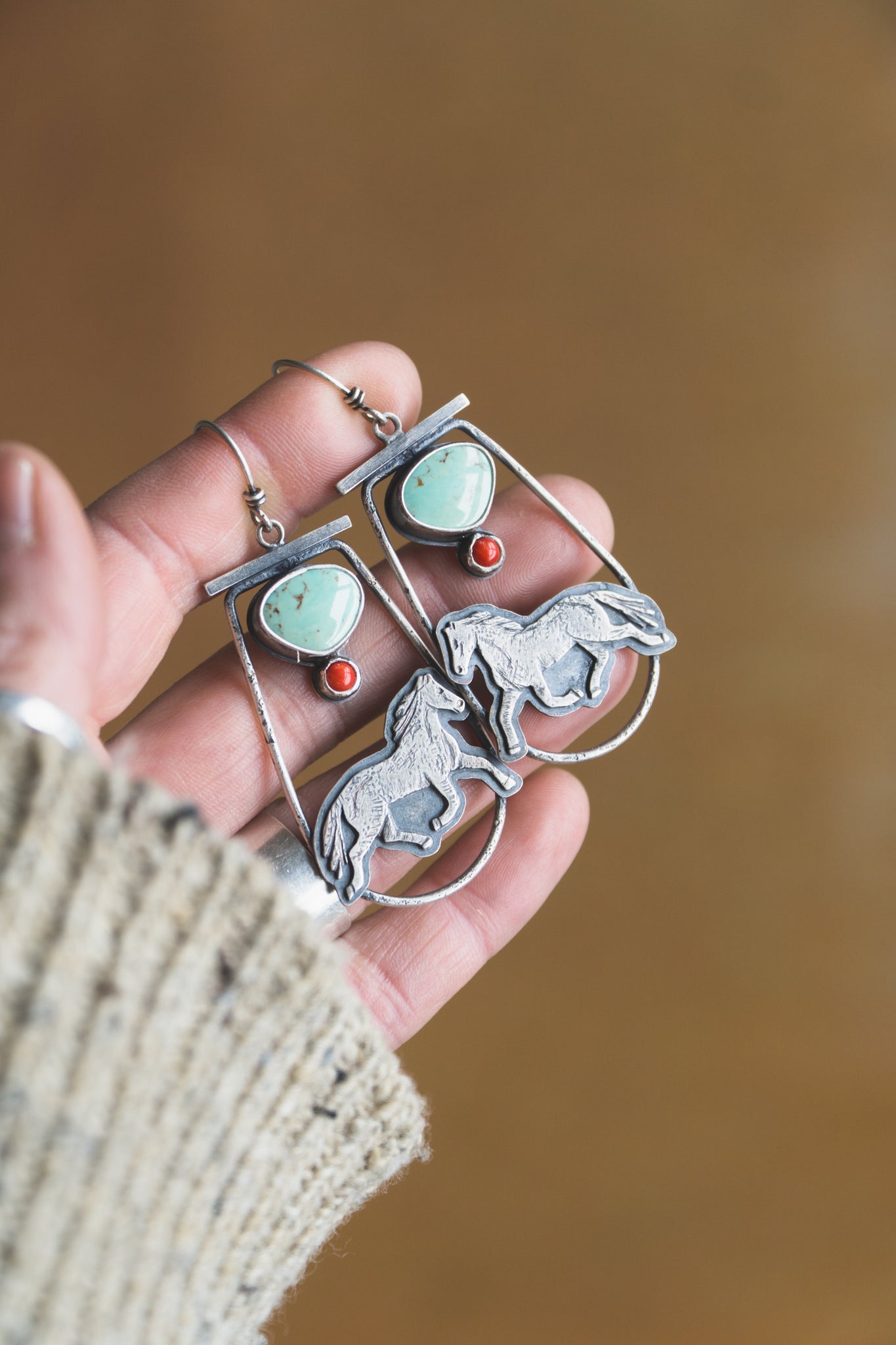 Inspired by the Lunar year of the Fire Horse. Kingman turquoise paired with red rosarita set with layers of textured sterling silver. Each earring weighs just under 8 grams and measures 2.5 inches in length.