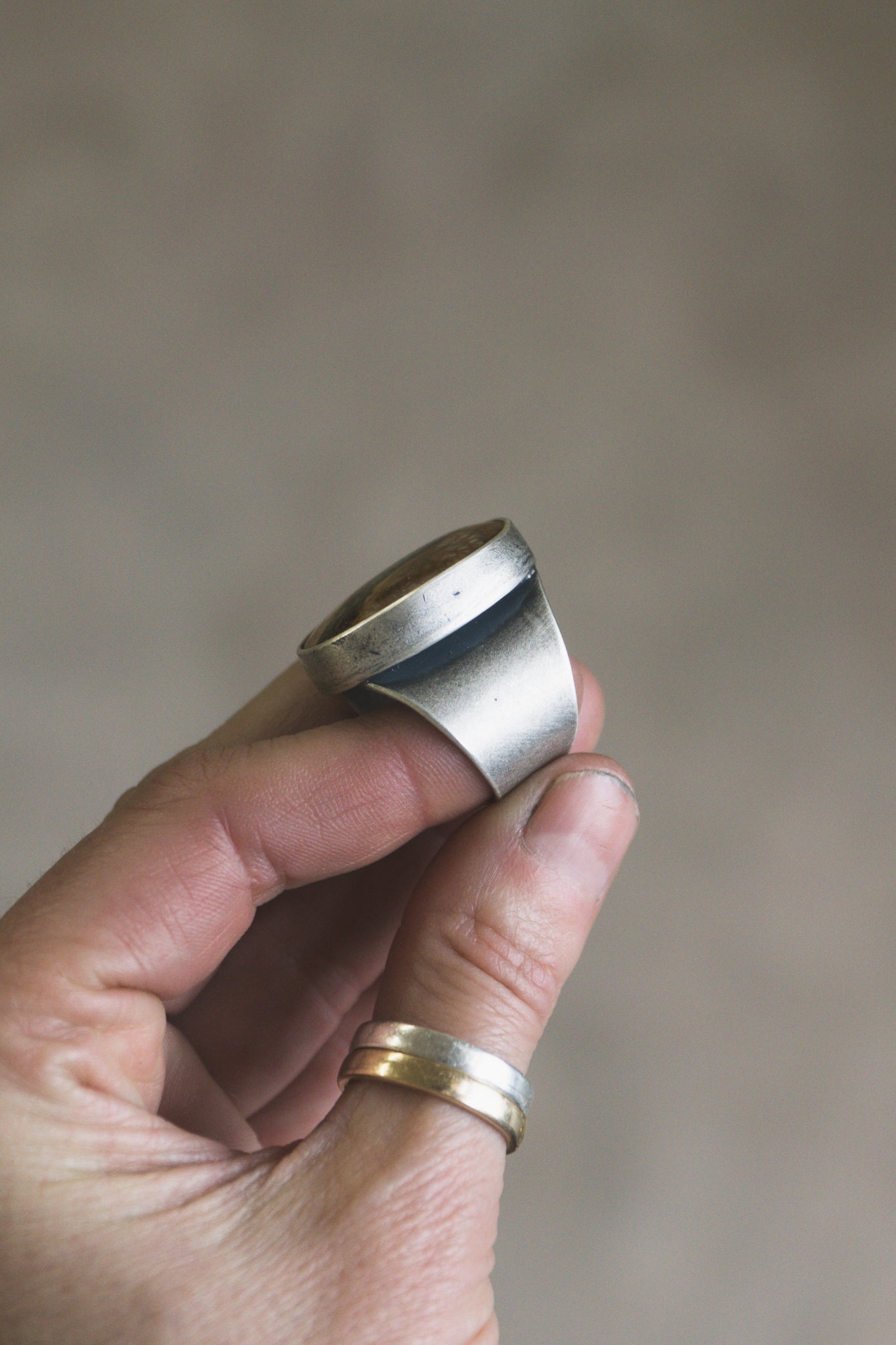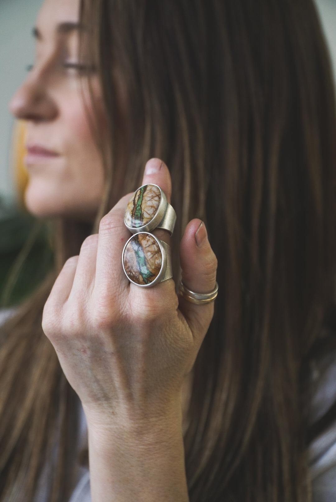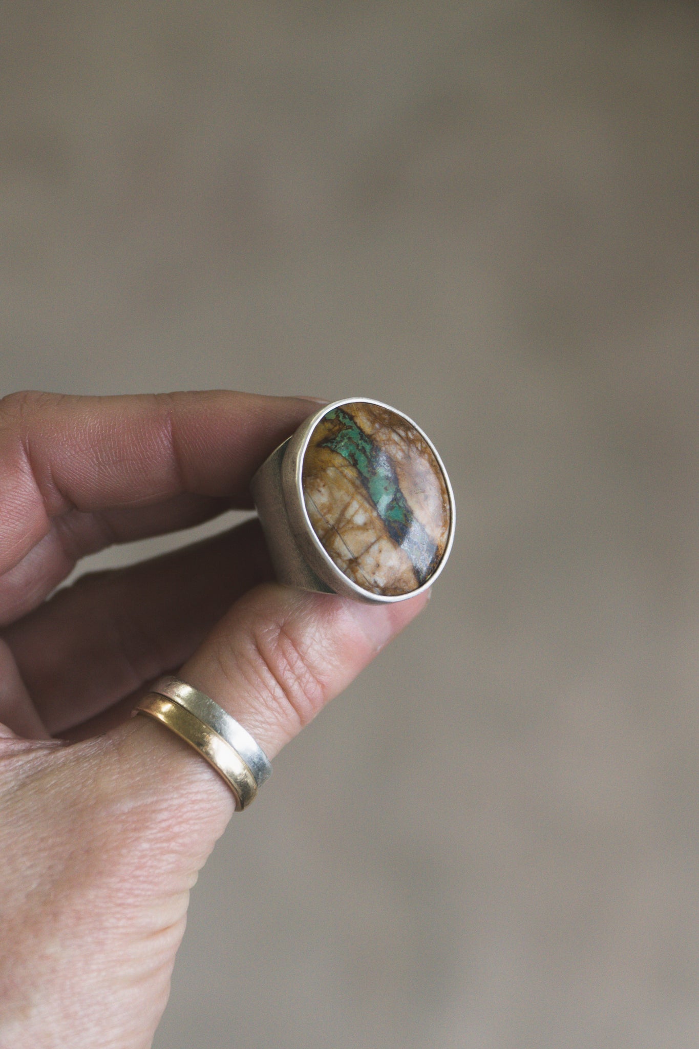 Built like a brick house. This ring features a high grade cut of Royston Ribbon set in sterling silver. This ring was made with over 95% repurposed silver which I personally melted down and remilled into workable metal. It's a long process but always feels so worth it. This ring sits at an 8 on my mandrel but will feel snug due to the width of the band and saddle across the top so it will fit more like a 7.5