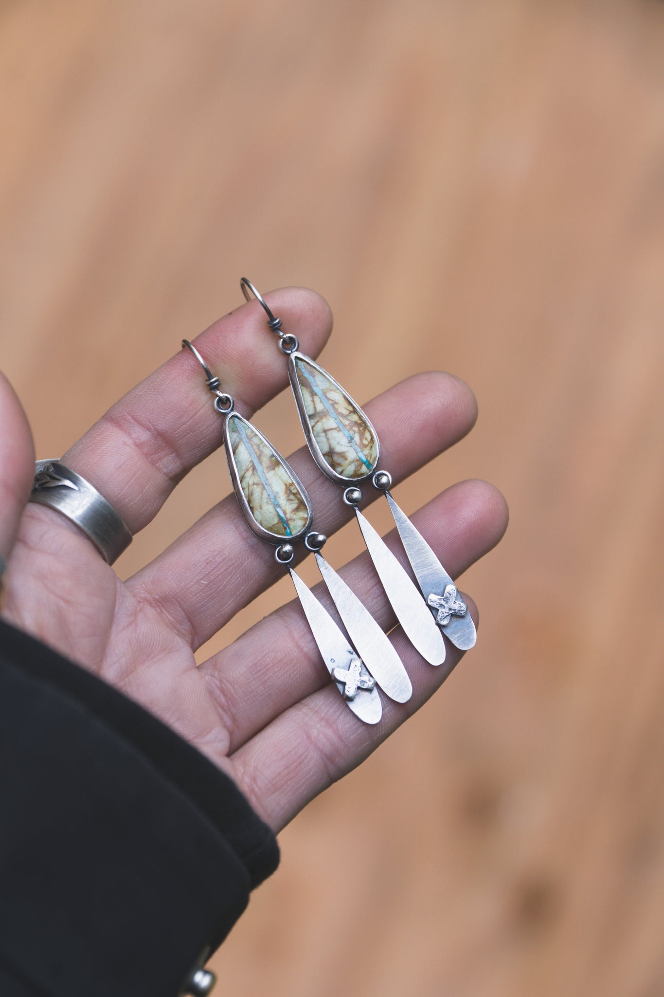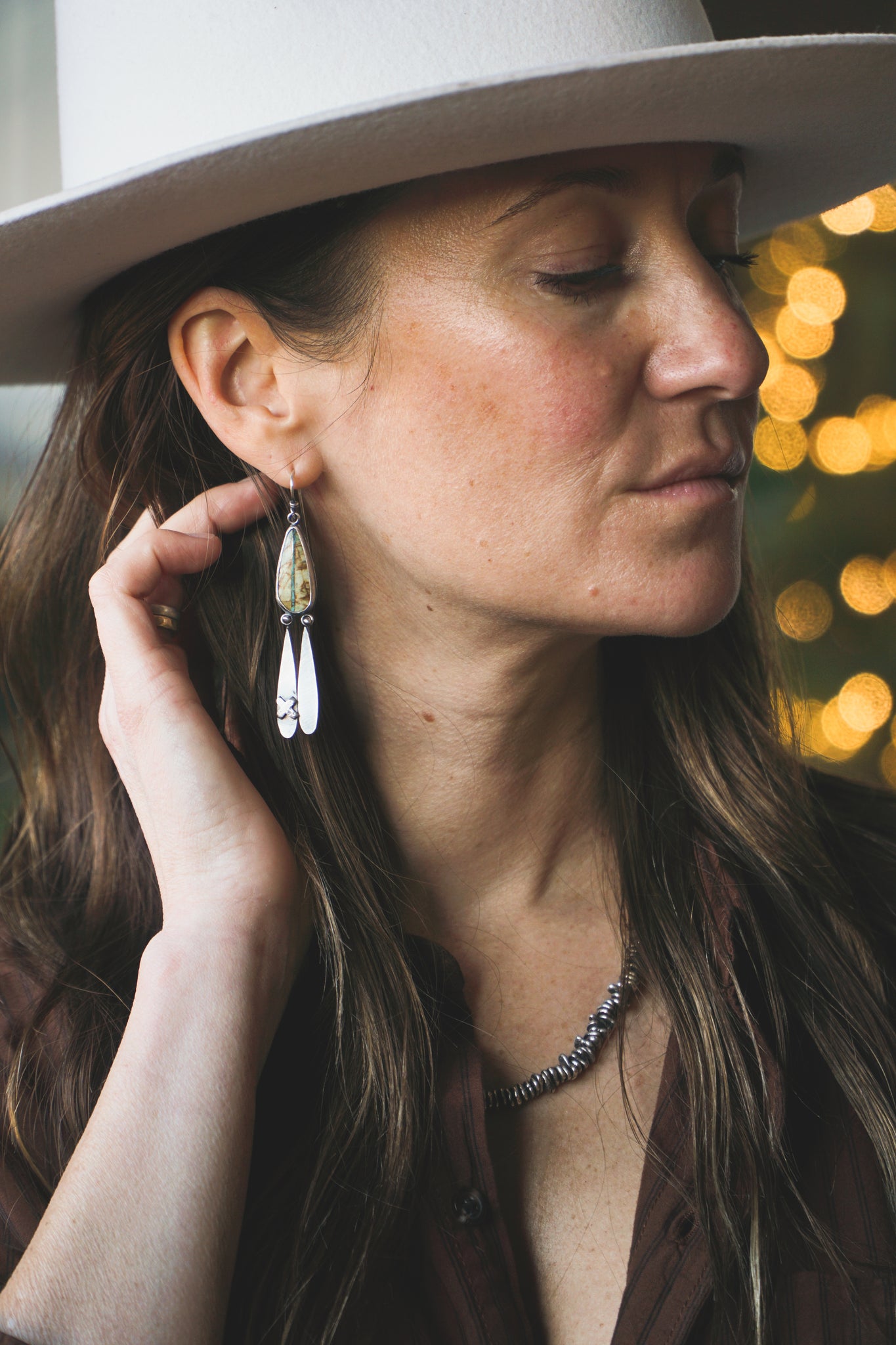 The kind of earrings I dream about. These Royston Ribbon stones have so much depth to them. Lightweight sterling silver fringe kissed with little x's. This pair measures just under 3 inches and weigh 5.5 grams each.