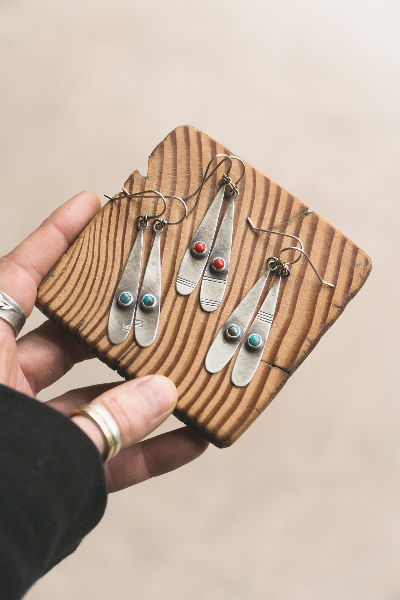These simple sterling silver drop earrings are light as air and are finished with a smooth heavy patina. They each measure about 2 inches in length and weigh only 2 grams a piece. Choose from Sonoran Turquoise or Coral.