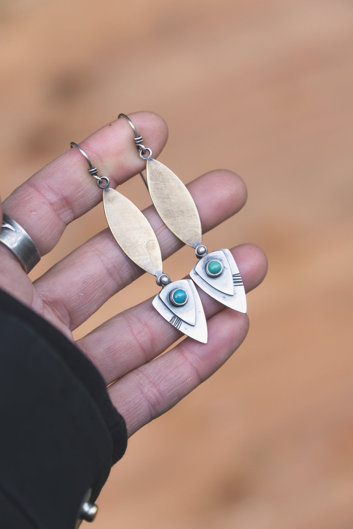 Sonoran Turquoise set over layered sterling silver and mixed with brass. 2 and 3/4 inches in length. Under 4 grams each in weight. A beautiful new design that plays with each movement in the ears.