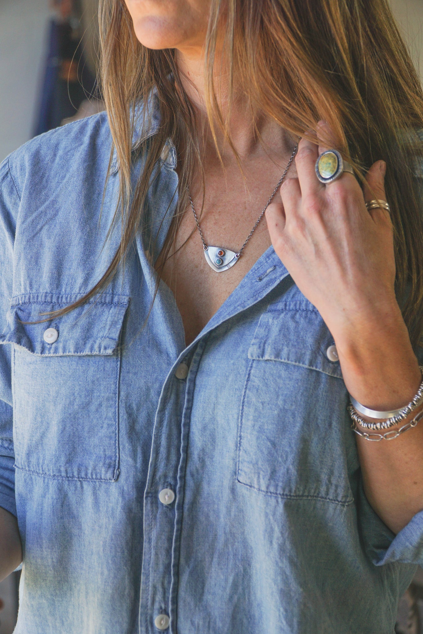A summer-meets-fall inspired necklace made with thick gauge layered silver and featuring warm baltic amber paired with sonoran turquoise. This pendant is strung on a simple and strong rolo chain with my handmade S hook for closure. It measures 18 inches in length.