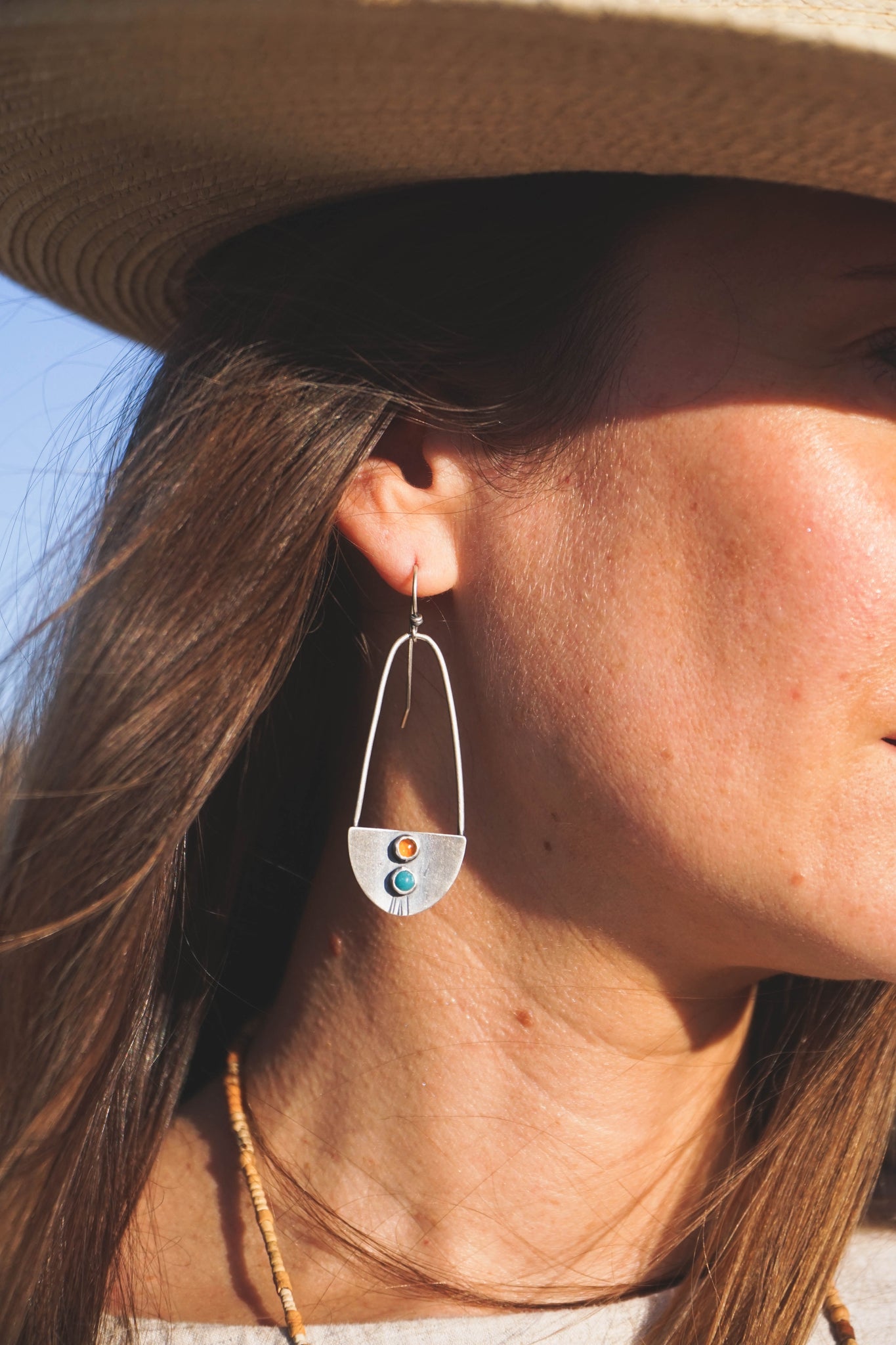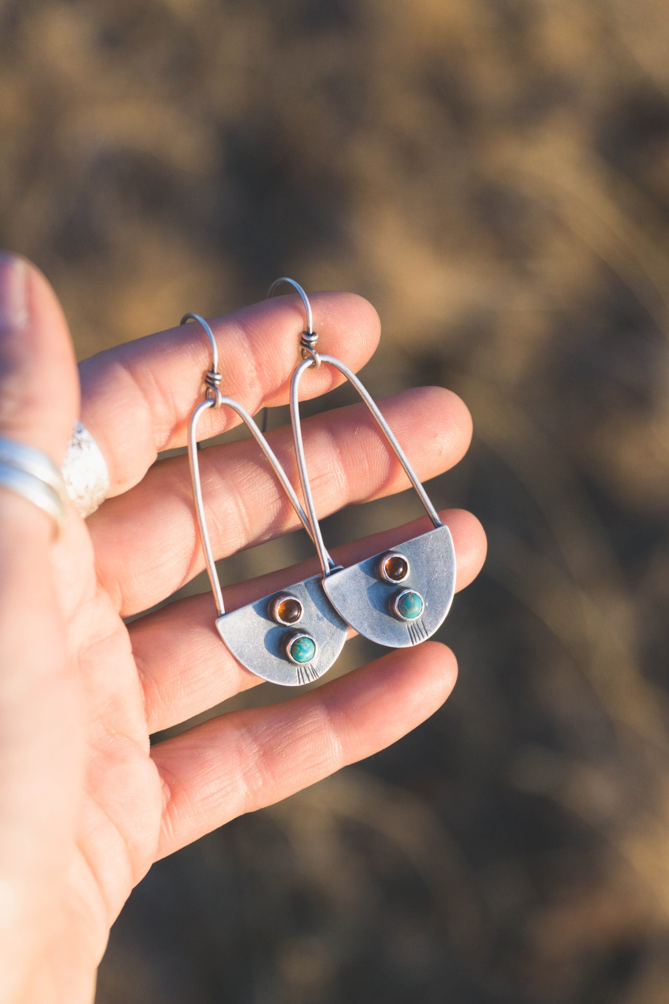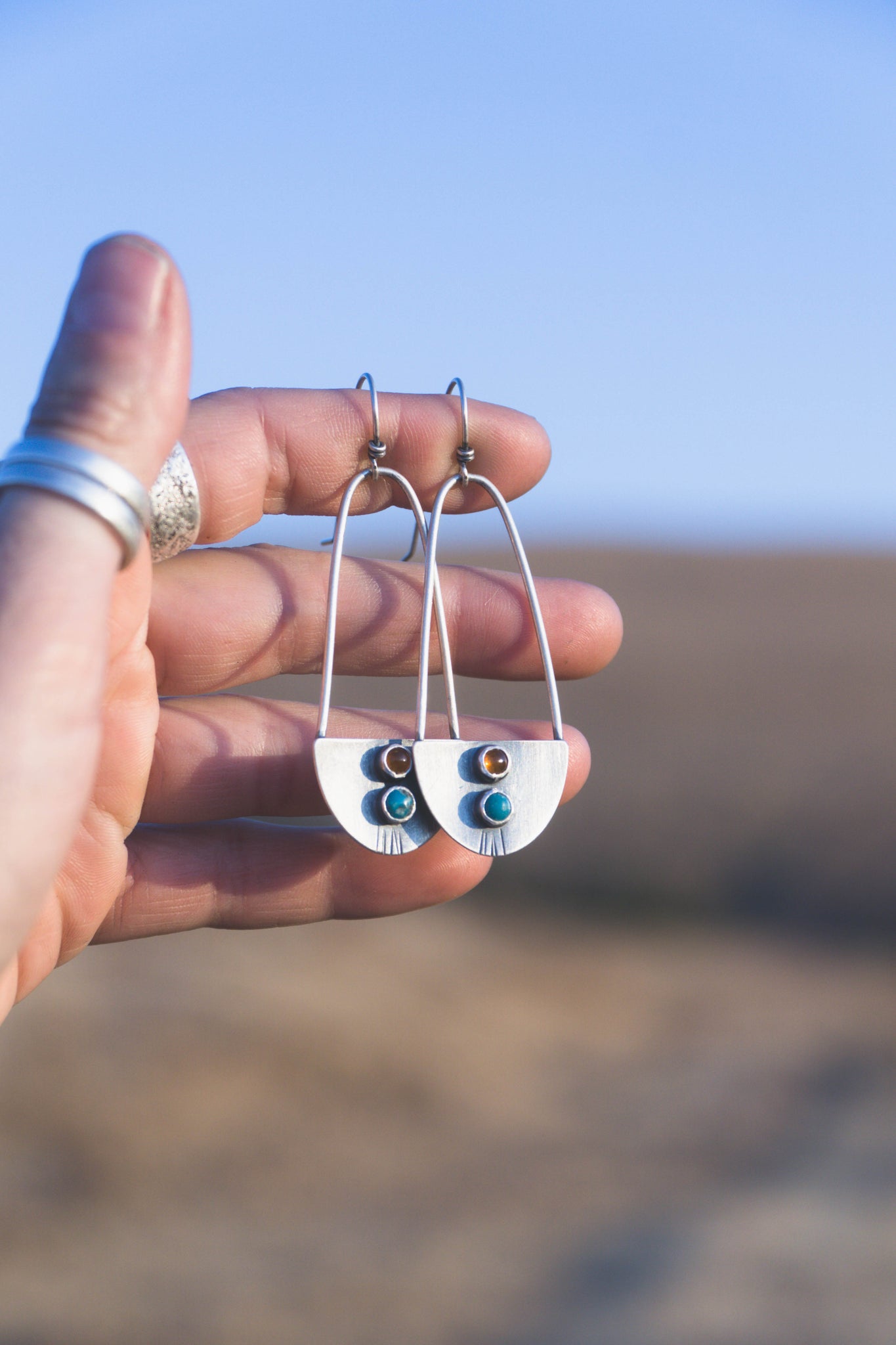 Summer storms are my favorite and we had a doozy of a thunder and lightning storm about a month back. This design was first inspired by some earrings I made waaaay way back for my long time friend, Melissa. I updated this pair with dual stones; one warm baltic amber paired with one sonoran turquoise. They measure about 2.5 inches and at only 3.5 grams they feel light as air in the ear.