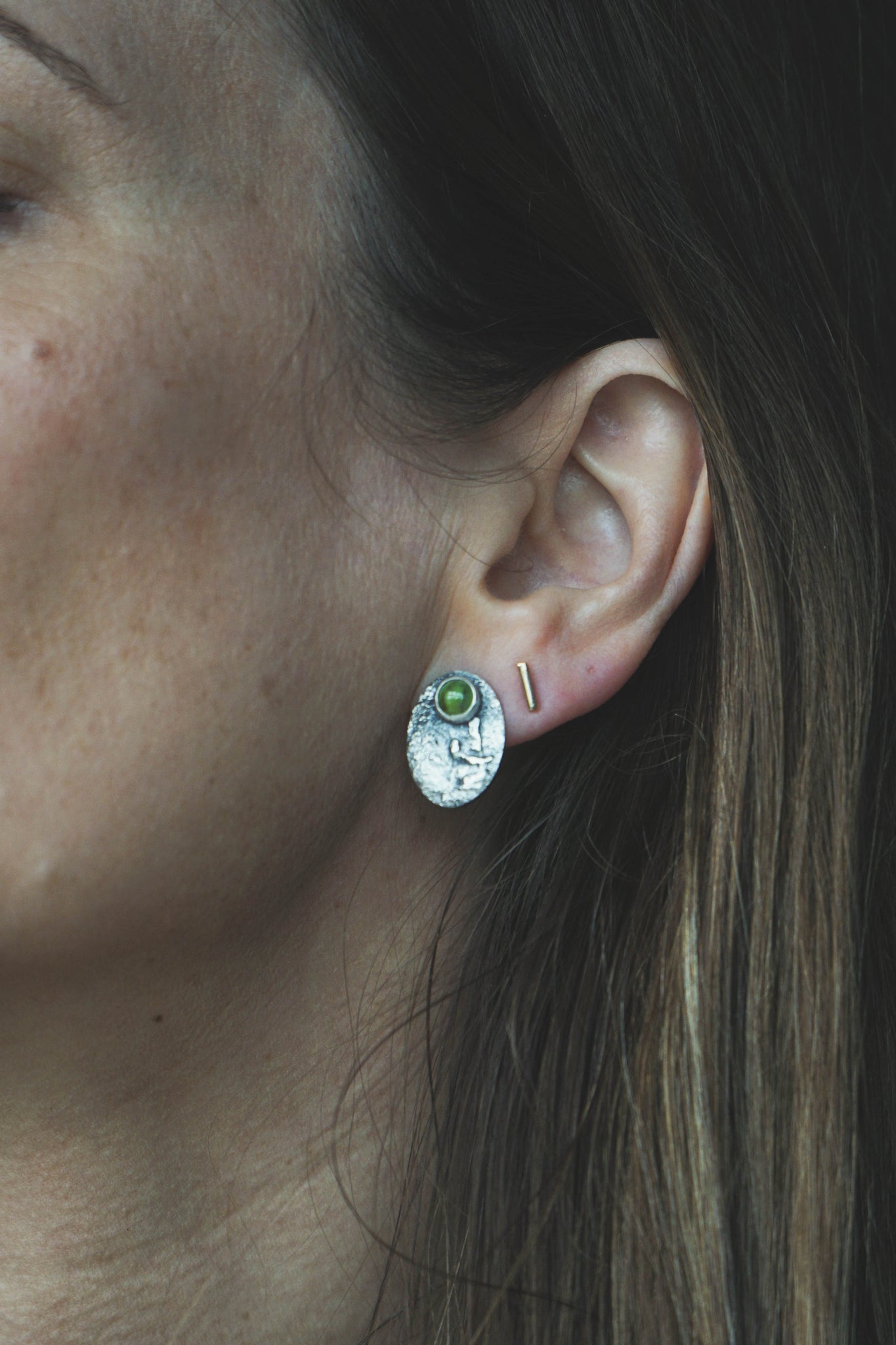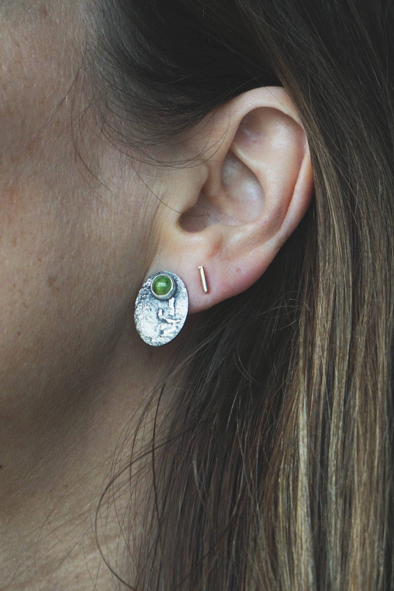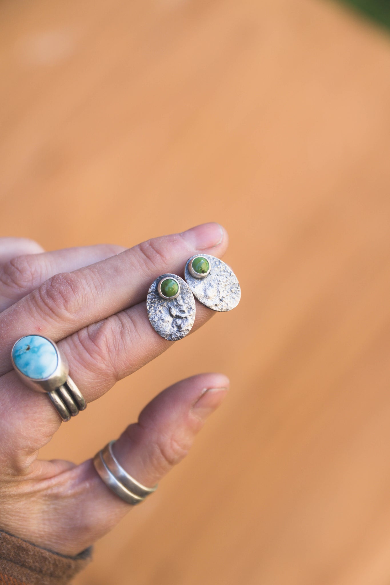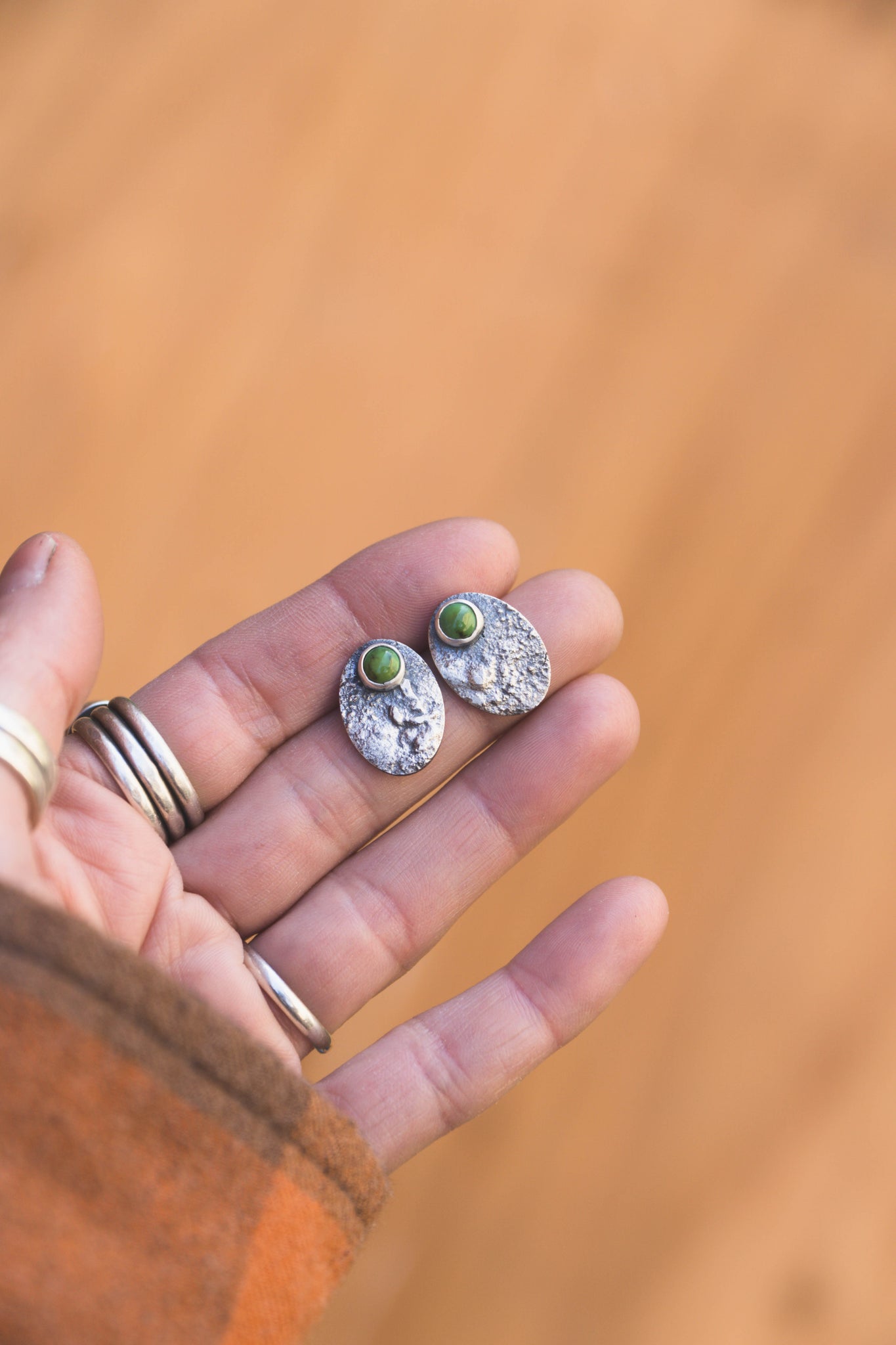 Heavily textured sterling silver studs featuring sonoran gold turquoise stones. Flat back posts keep these earrings comfortable in the ear. A simple but bold statement for anyday and everyday wear.