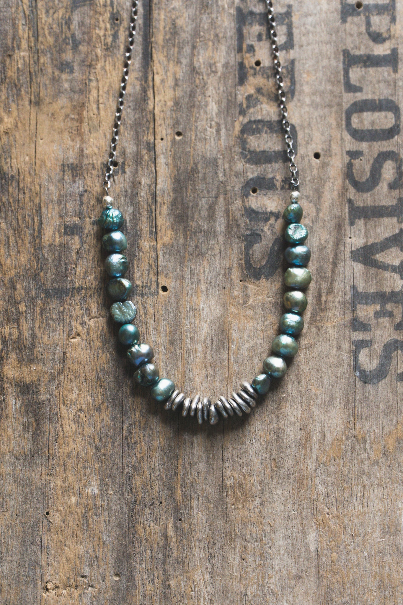 This partial bead strand features soft teal colored pearl beads paired with handcrafted sterling silver beads. Strung on lightweight but strong rolo chains and finished with my handmade S hook and closures. Measures 20 inches in length.