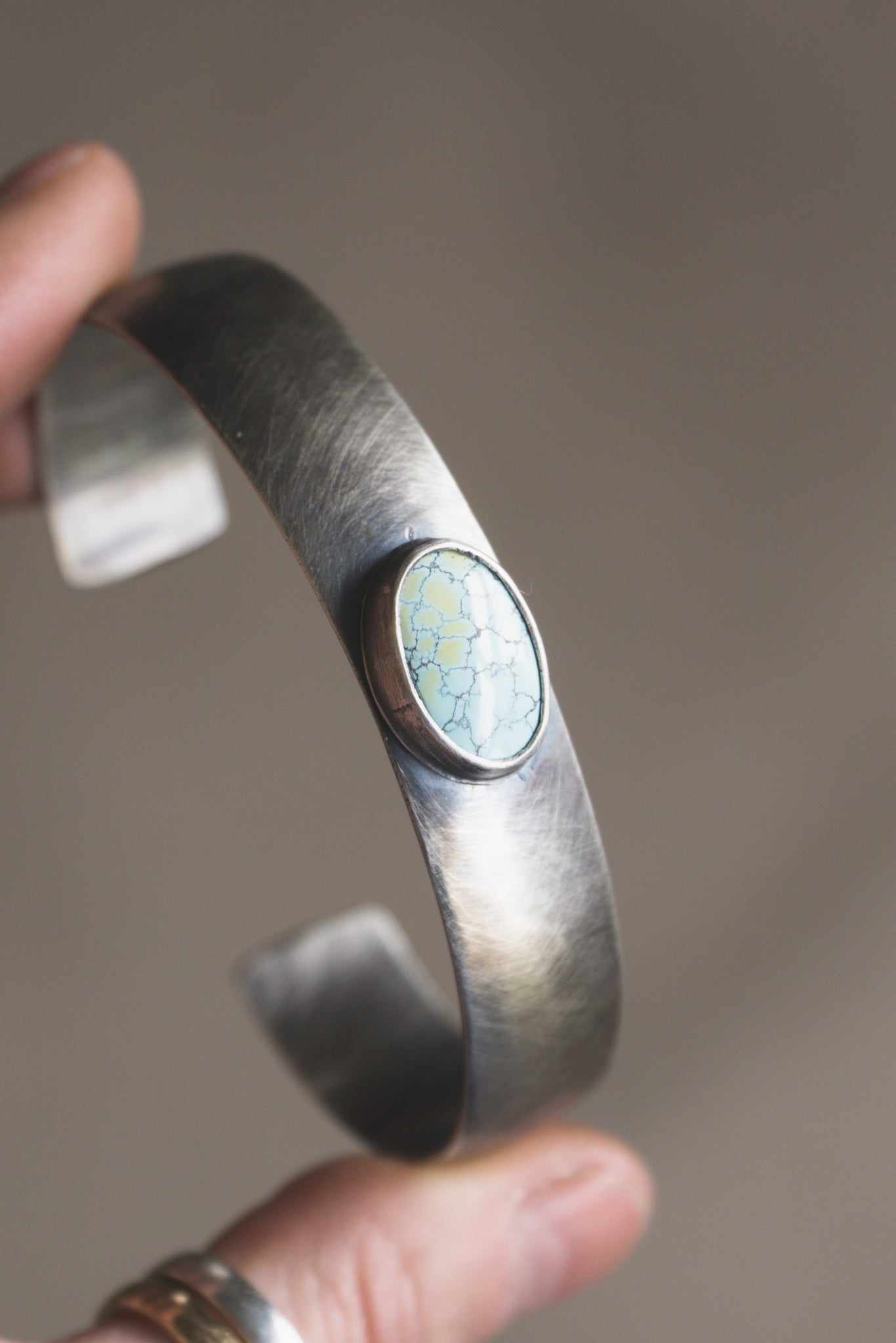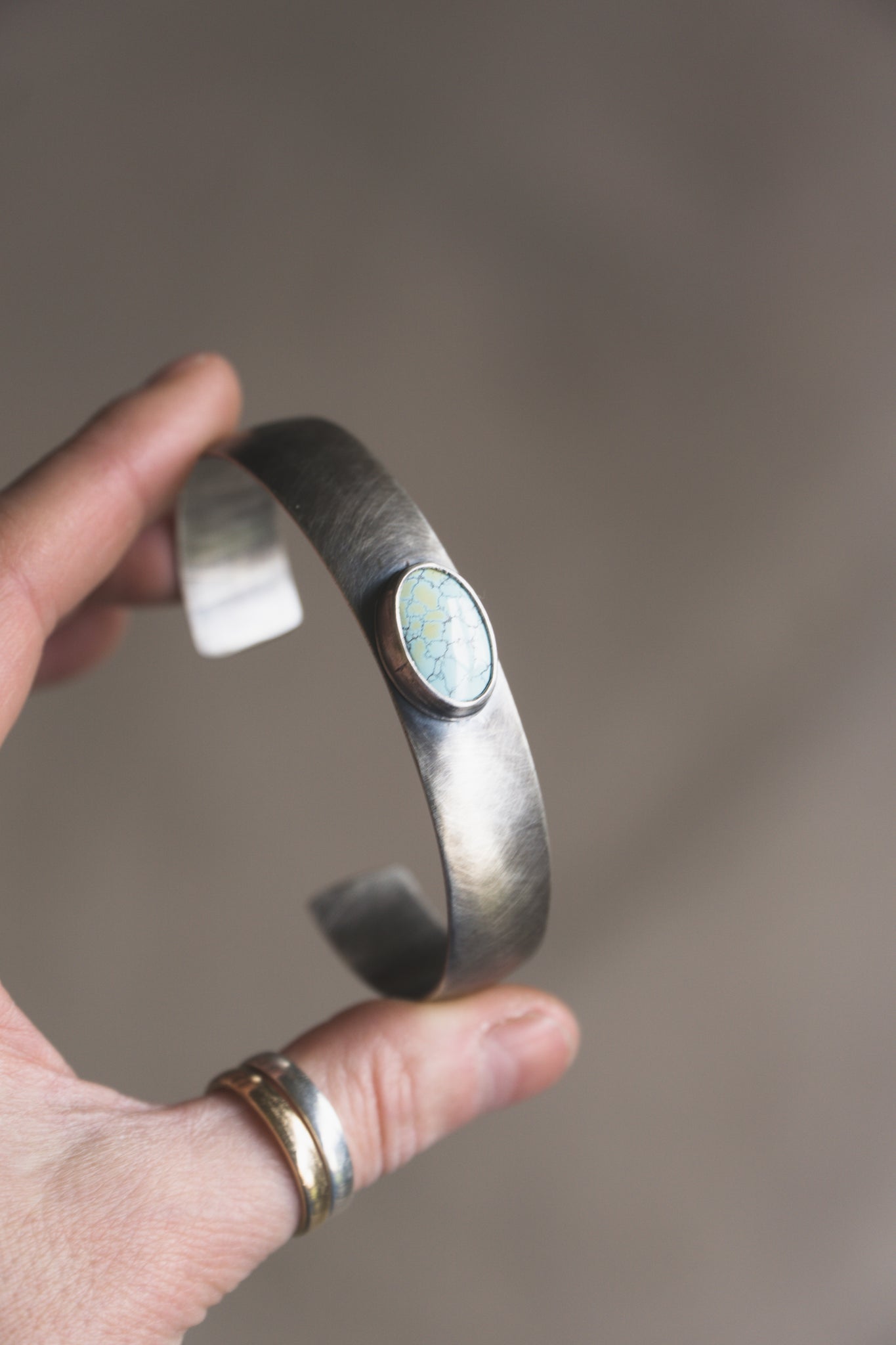 This cuff features a high grade cut of Hubei Turquoise set in sterling silver. The cuff is formed from substantial and heavy gauge domed silver for a smooth and comfortable fit. This cuff measures 6.5 inches with a one inch opening and should comfortably fit a 7 inch wrist. It can be sized down to fit any wrist measurement at no additional cost.