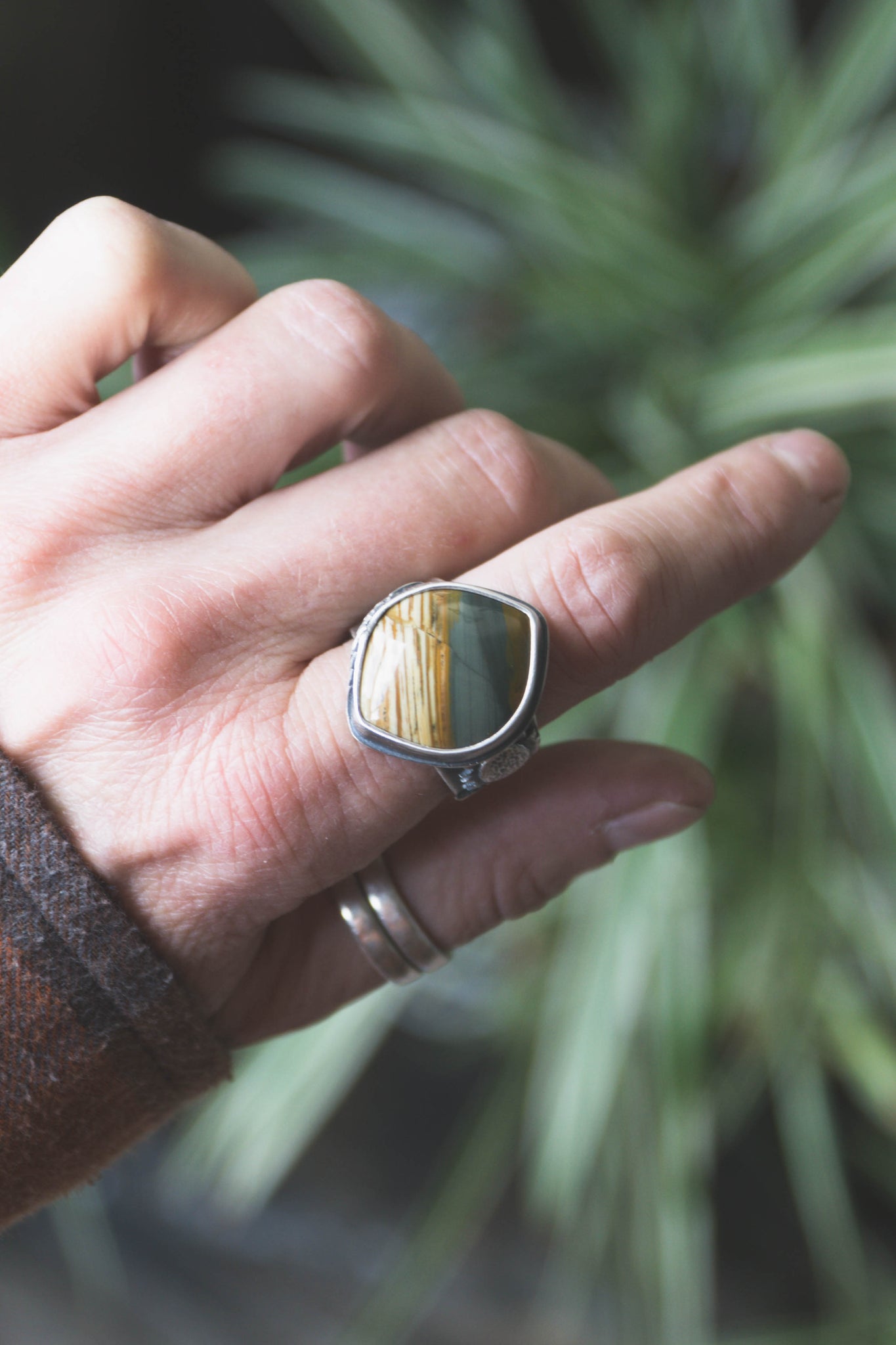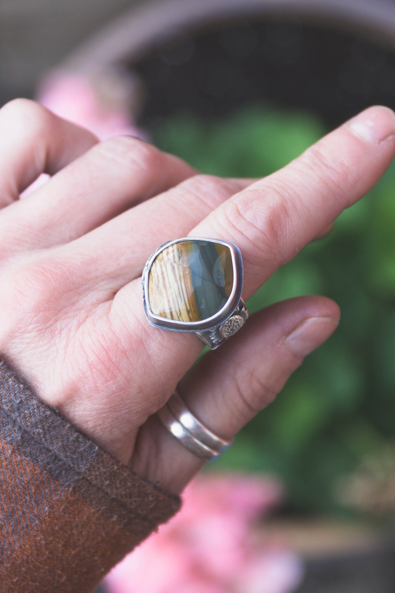 Featuring a Blue Mountain Jasper stone that I personally cut, shaped, and polished for this design. There is a sprig of wheat along the bezel that surrounds and protects the stone, and a fully bloomed sunflower on the band. This ring has a rustic finish that willwear in, not out. Set in heavy gauge sterling so you can wear it with confidence and had it down to future generations. Ring band is tapered for comfort. Size 9.25