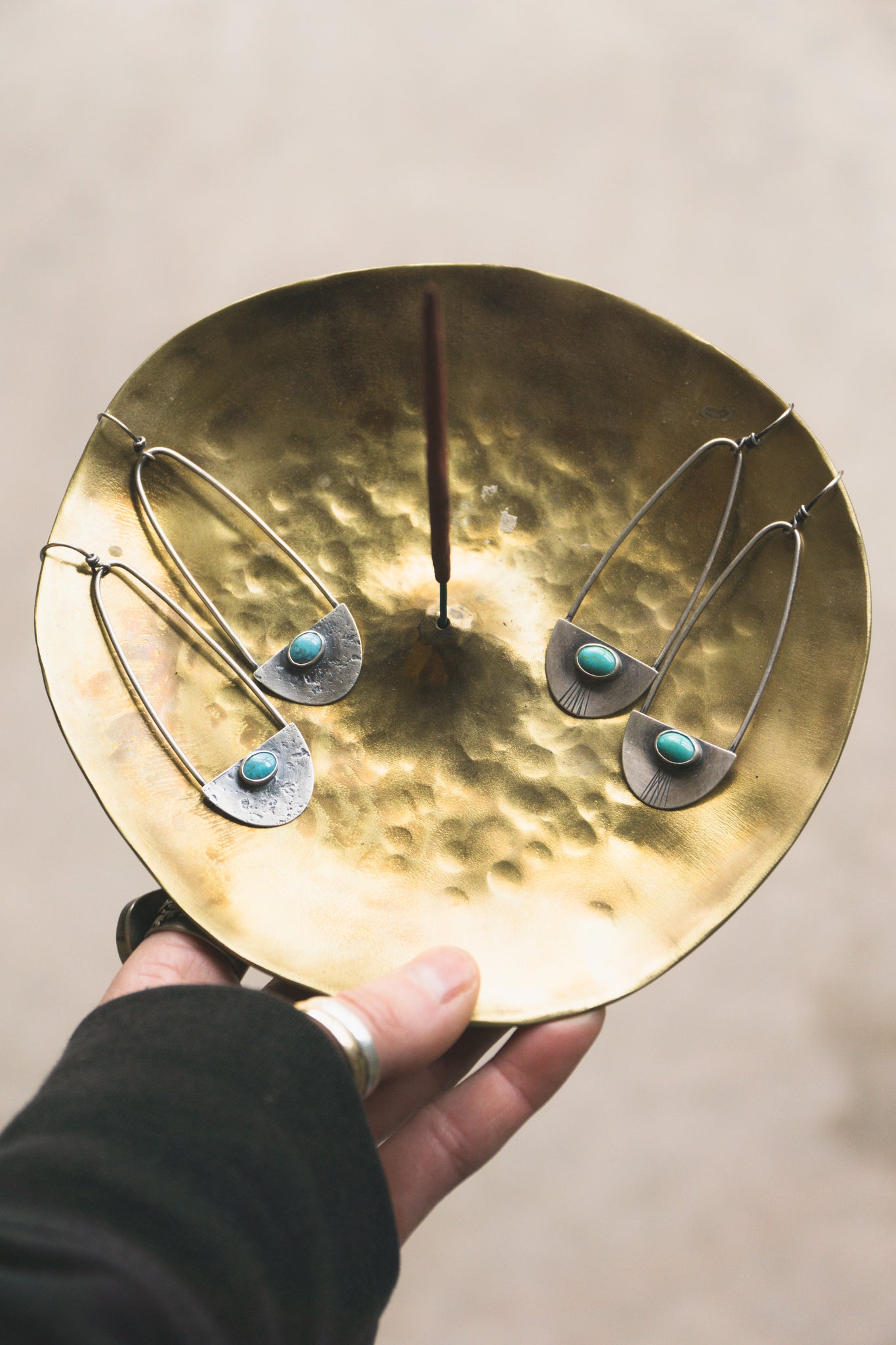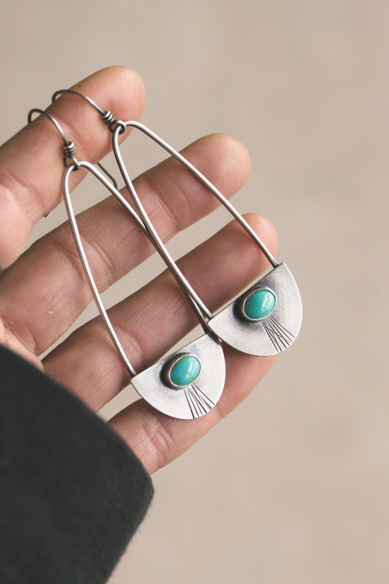 This design was first inspired by some earrings I made waaaay way back for my long time friend, Melissa and they have quickly become a staple design in my offerings. This pair features gorgeous teal blue sonoran turquoise set simply in sterling silver. They measure about 2.5 inches and at just 4.3 grams they feel light as air.