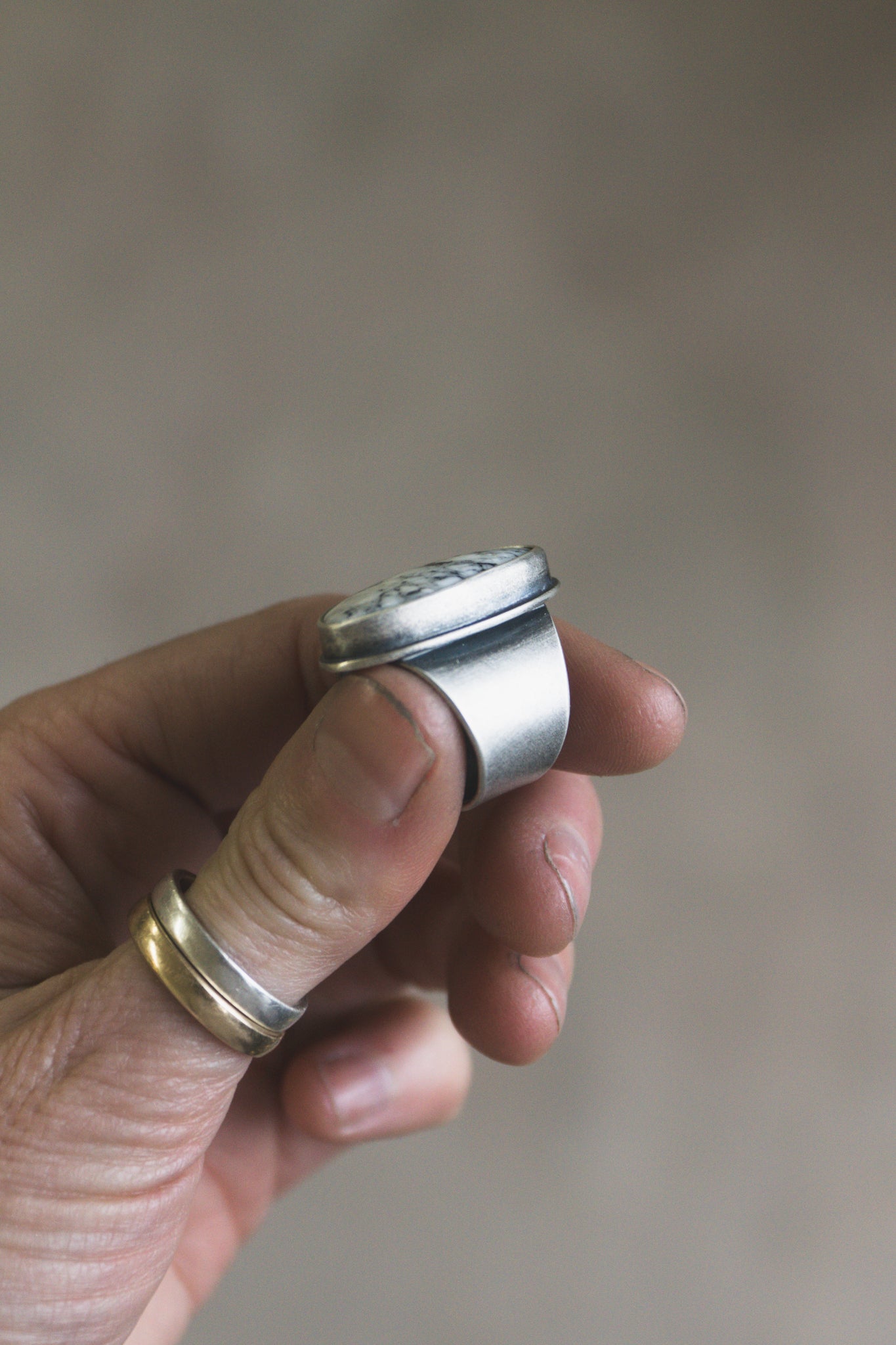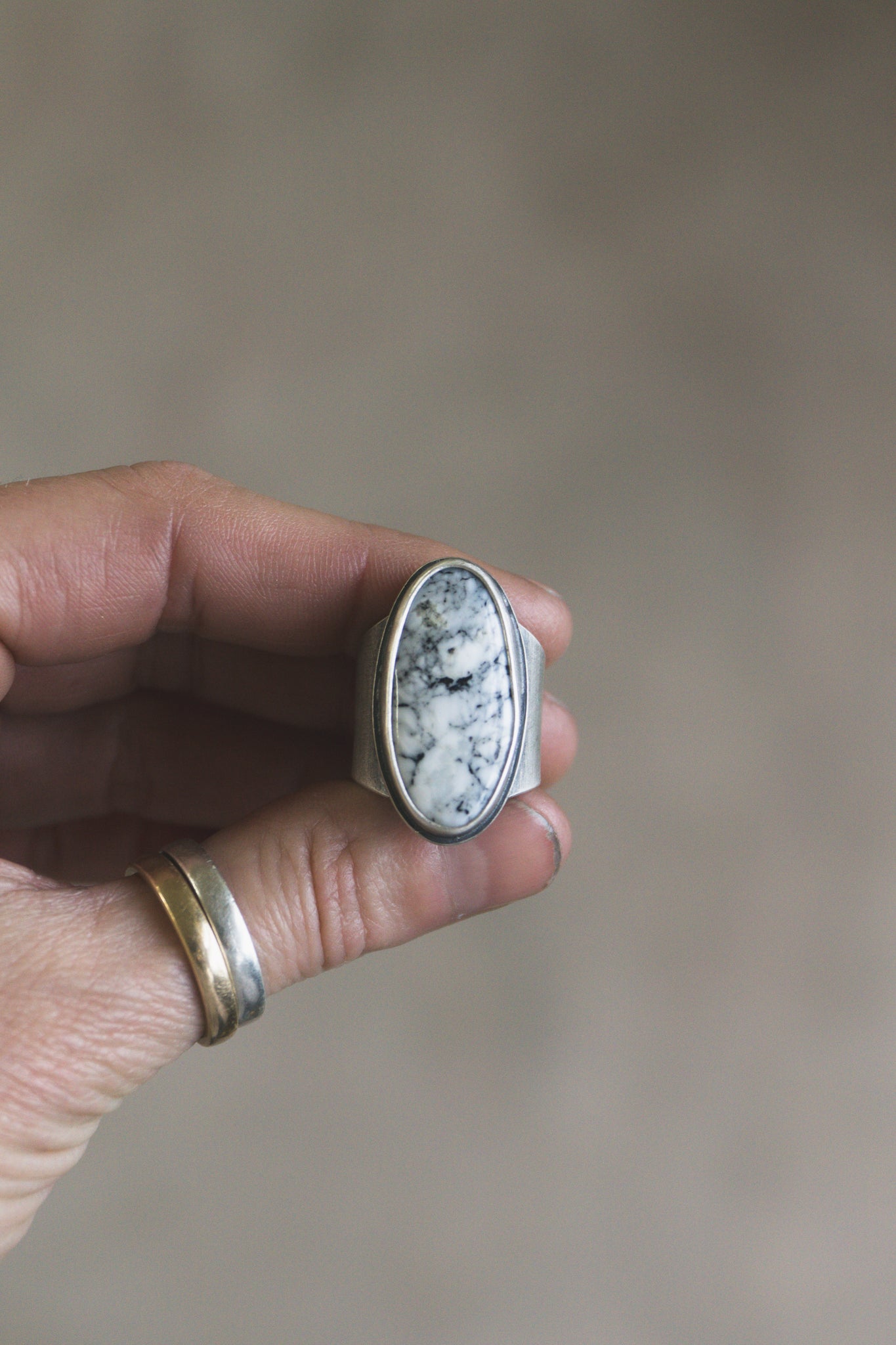 Built like a brick house. This ring features a high grade cut of White Buffalo set in sterling silver. This ring was made with over 95% repurposed silver which I personally melted down and remilled into workable metal. It's a long process but always feels so worth it. This ring sits at an 6 on my mandrel but will feel snug due to the width of the band and saddle across the top so it will fit more like a 5.5